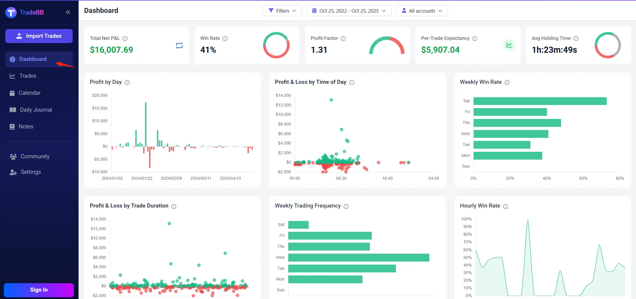 TradeBB’s "Performance Dashboard" is the core of data visualization, aggregating 6 key metrics and 8 dynamic charts to help you quickly identify trading strengths and weaknesses: