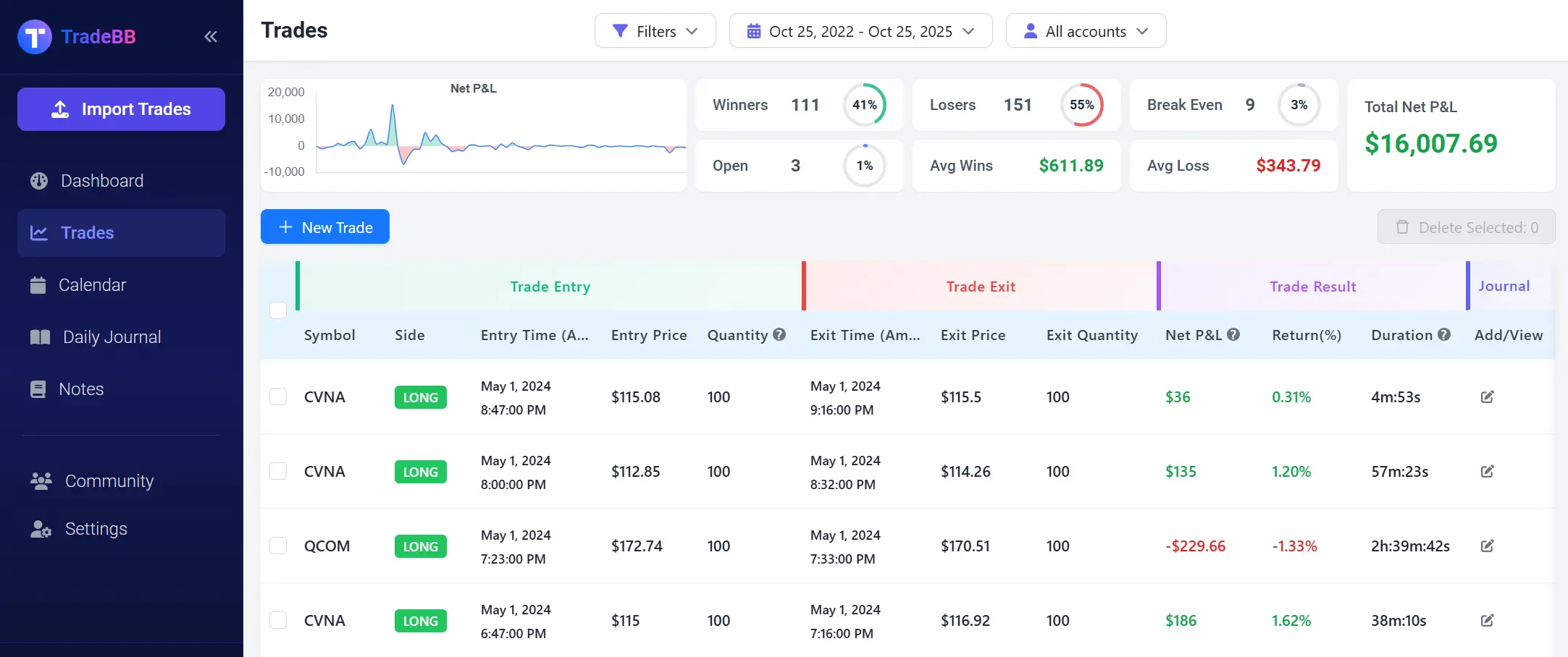TradeBB directly addresses this pain point by supporting seamless integration with mainstream trading platforms such as MetaTrader 4/5, TradeLocker, and cTrader. After API authorization, all your trading data—including asset symbol, position direction (long/short), real-time price, and executed volume—syncs automatically to the platform, no manual entry required. For example, if you execute a EURUSD long position on MetaTrader, the data will appear in TradeBB’s "Trades" module within 5 seconds. The system also automatically calculates net P&L, return rate, and holding duration—even granular details like "1.36% return rate" or "24-day holding period" are accurate, eliminating errors from "manual calculations" or "missing data."