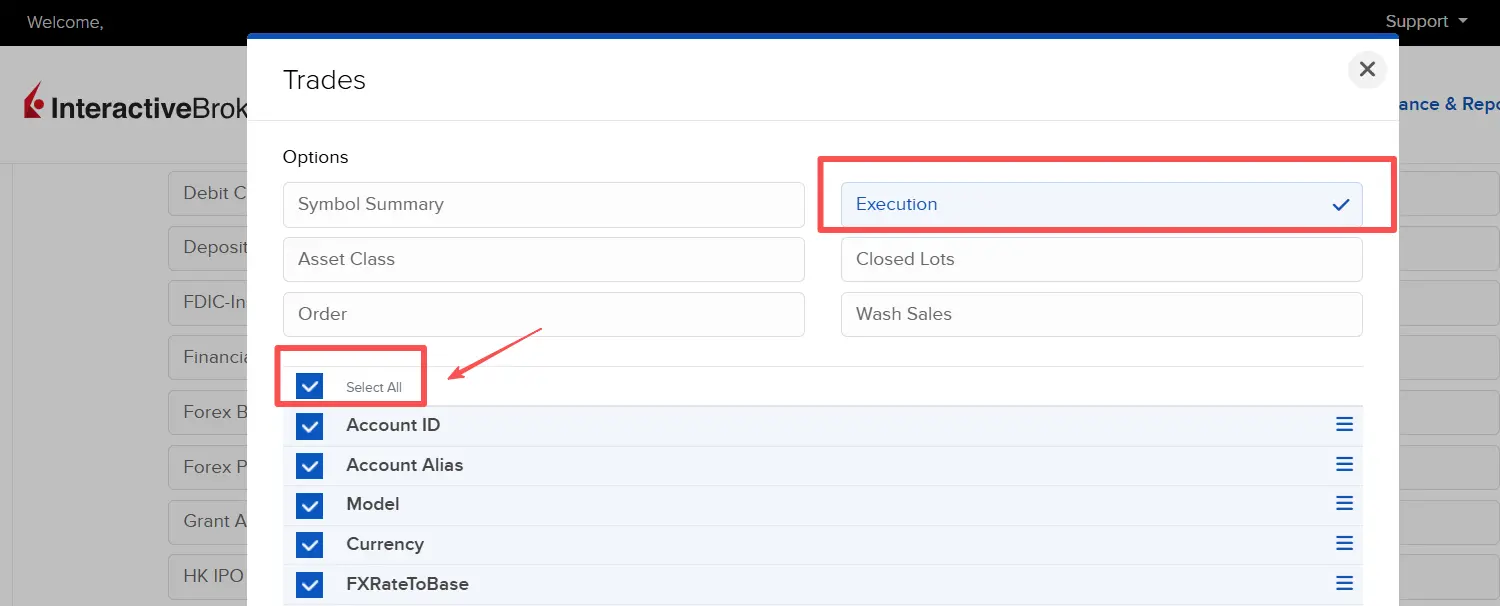 - Check the box for Select All to ensure all necessary data points are captured for your trading journal.
