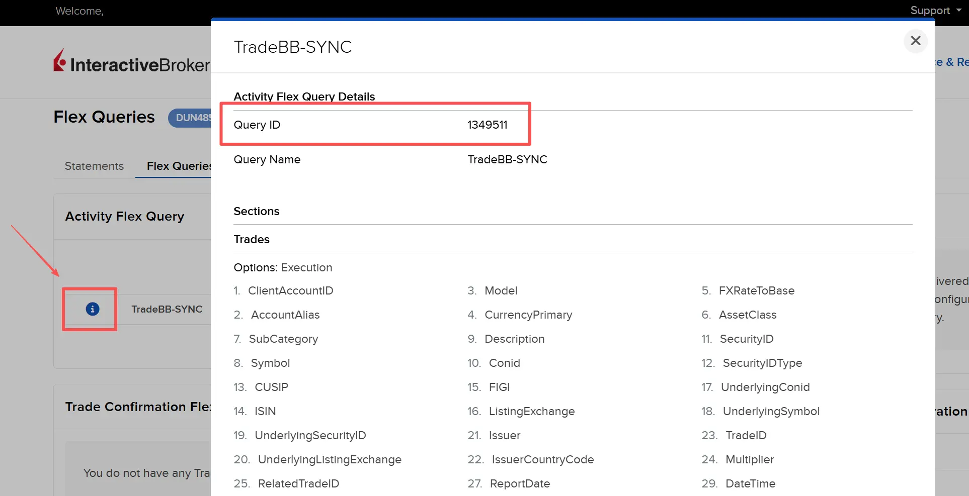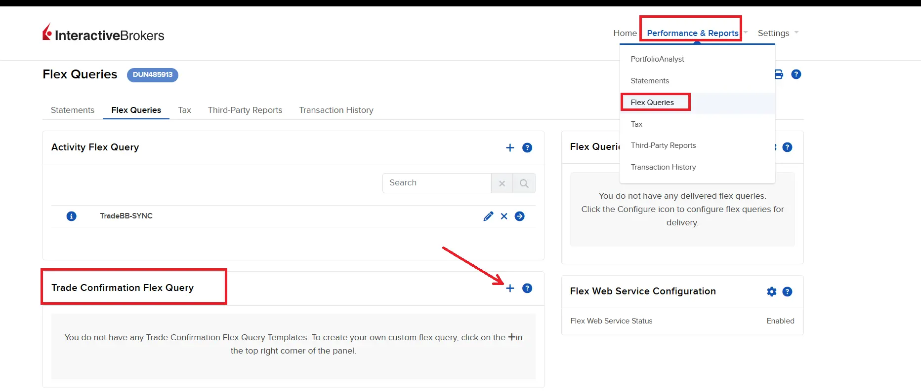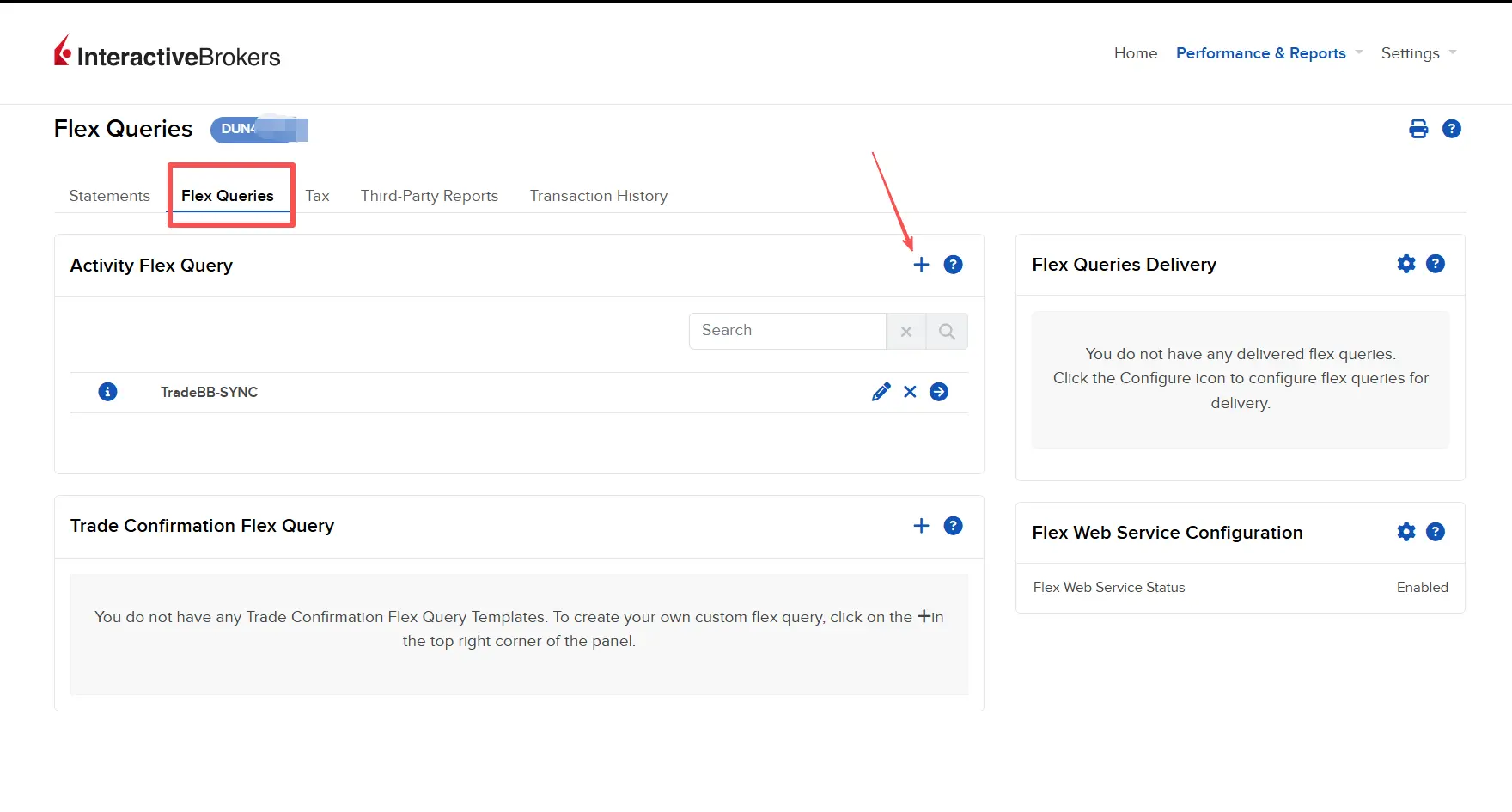 - Locate the Trade Confirmation Flex Query section and click the + (Plus) icon.