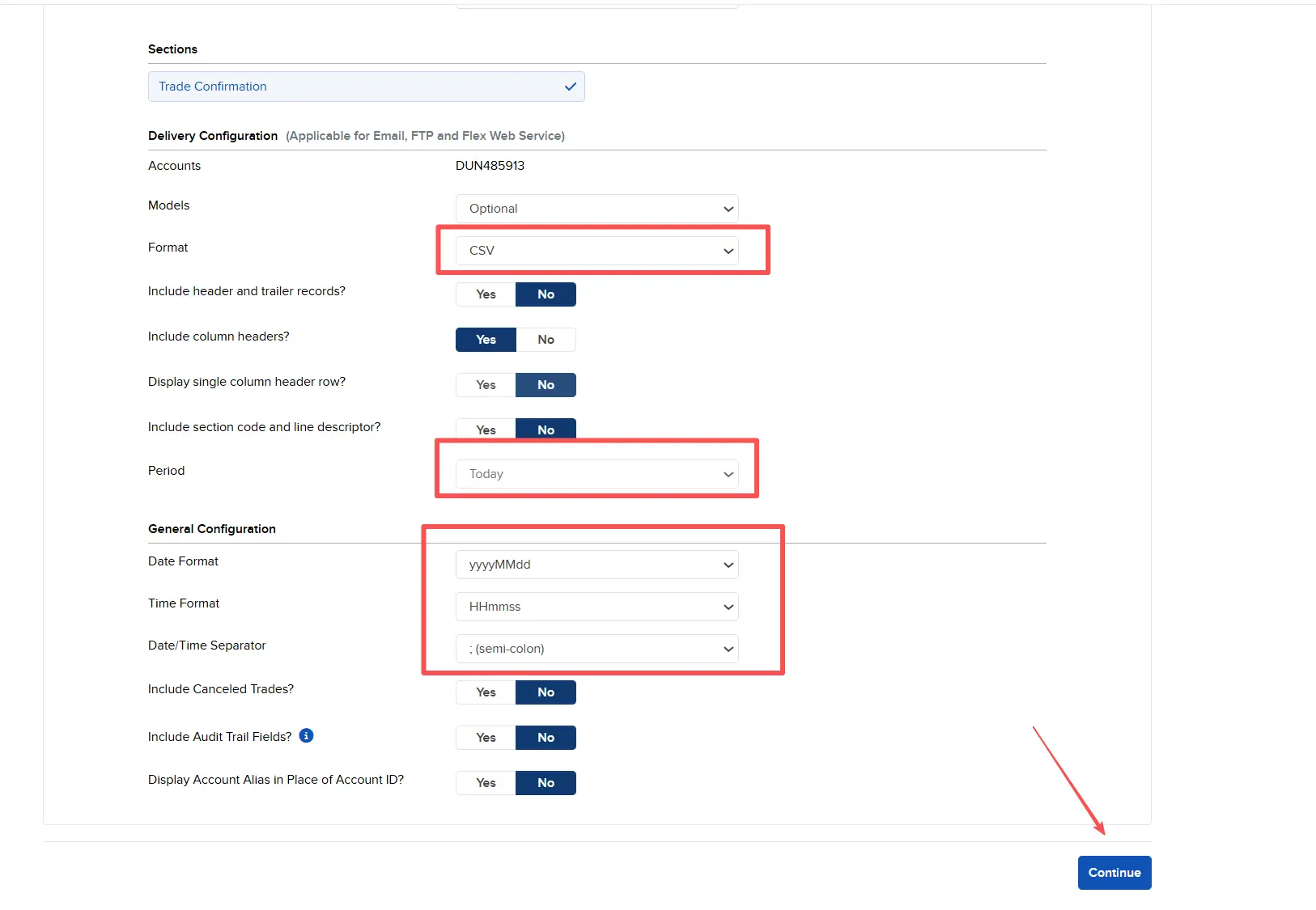 - Format: Under "Delivery Configuration," change the format to CSV and ensure "Include Header/Column Names" is checked.